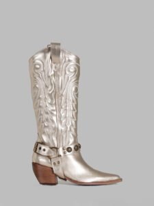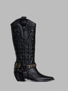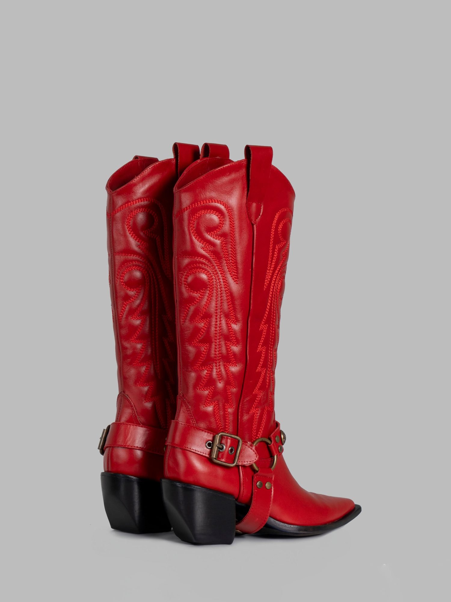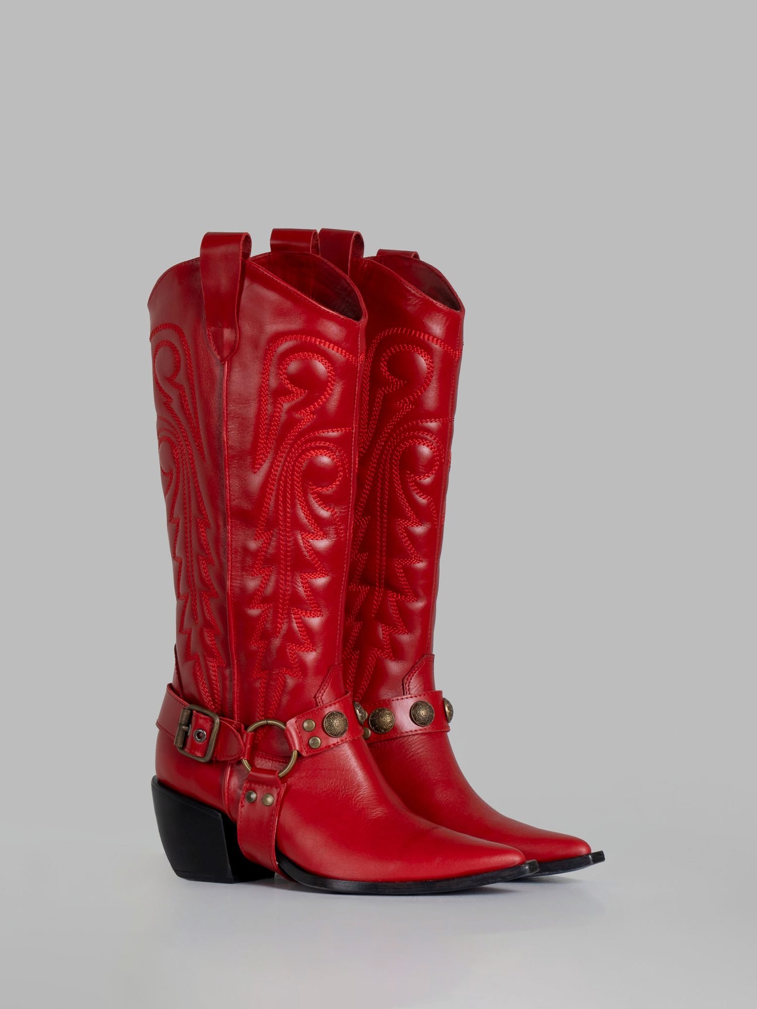 High-shaft boot crafted from red cowhide leather. This bold yet elegant design features delicate embroidery and antique bronze hardware, adding contrast and sophistication to every step.
