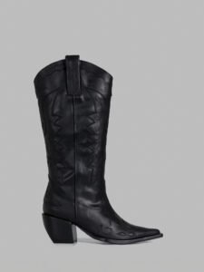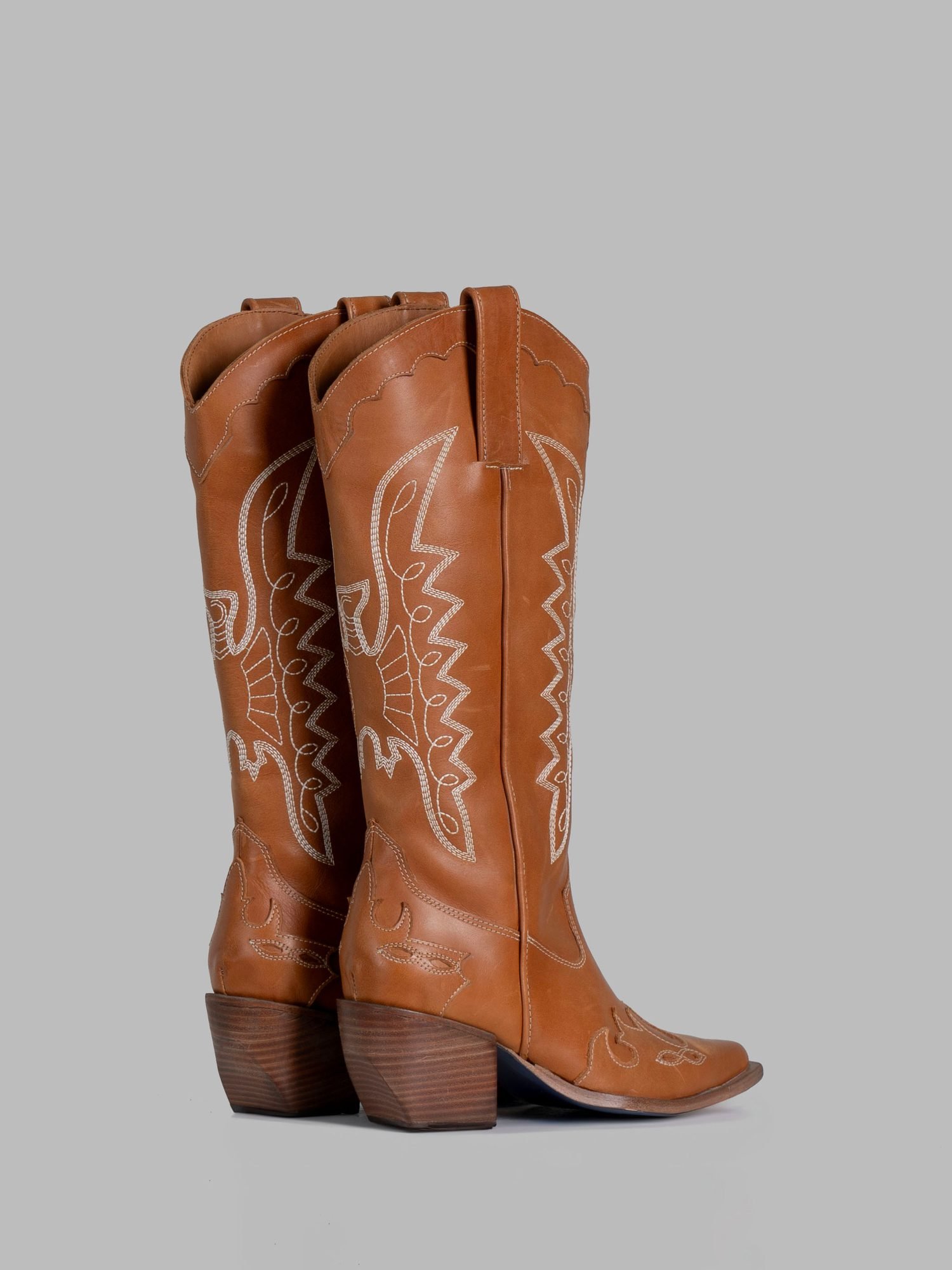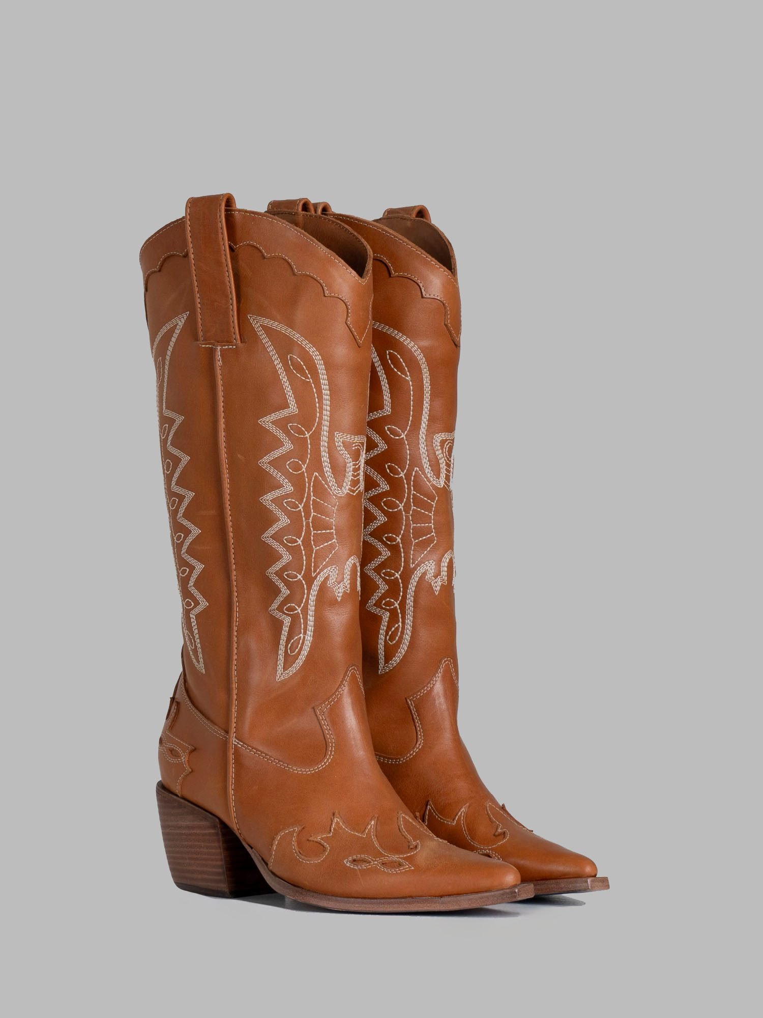 High-shaft boot crafted from tan cowhide leather. The design features delicate embroidery in natural tones and structured cutouts on the toe, blending western charm with refined femininity.