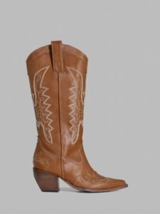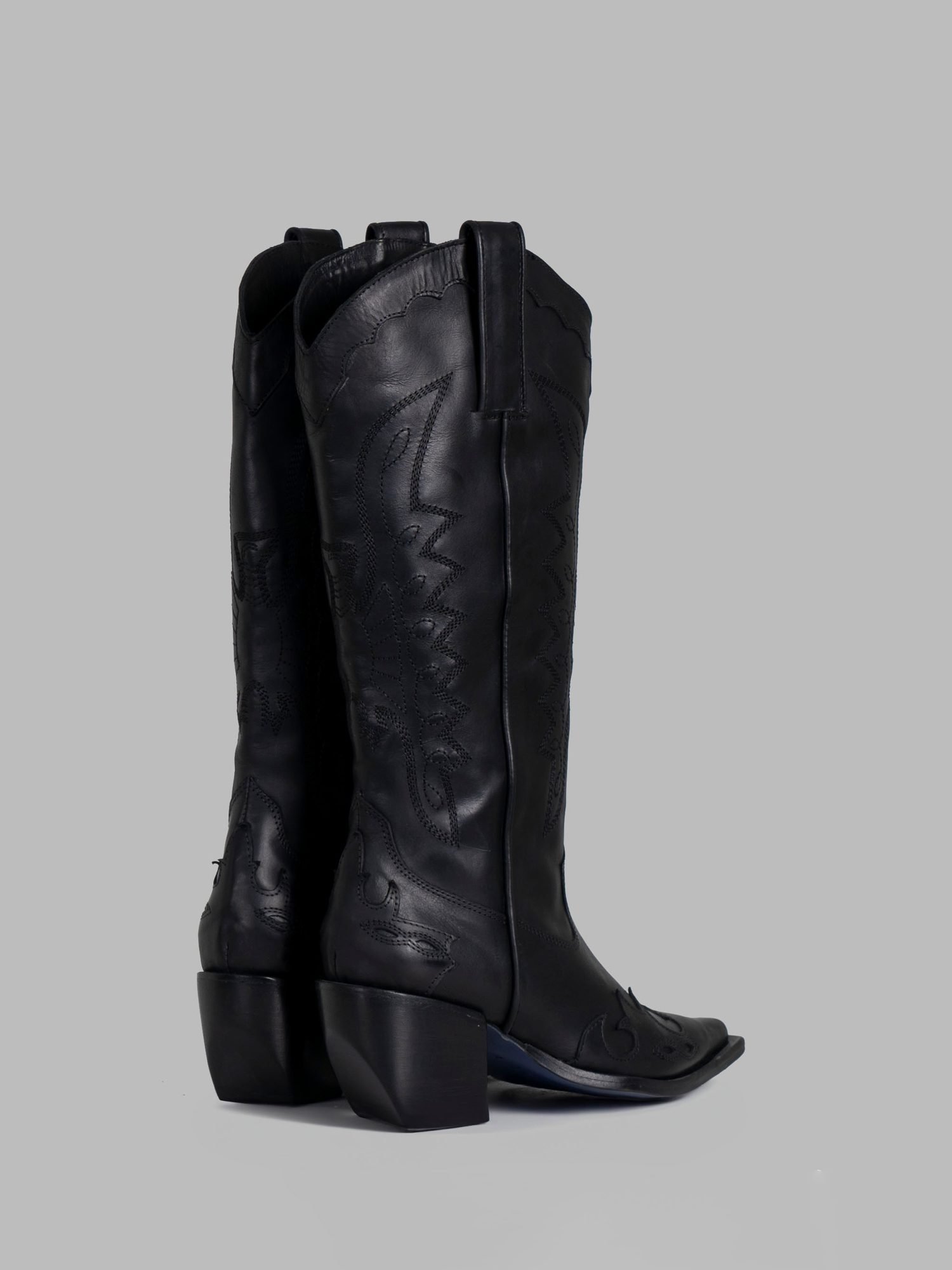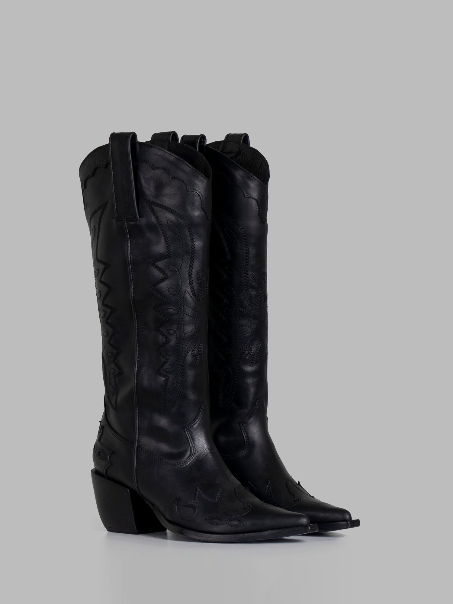High-shaft boot crafted from black cowhide leather. Elegant tone-on-tone embroidery and detailed cutouts on the toe give it a sophisticated and bold identity.