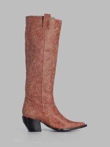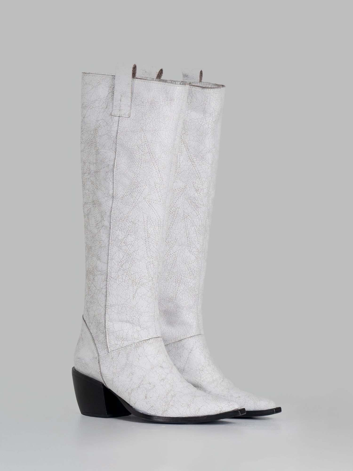 High-shaft boot crafted from textured white cowhide leather. Its sophisticated design allows the shaft to be worn stretched or naturally folded, thanks to the softness and flexibility of the leather.