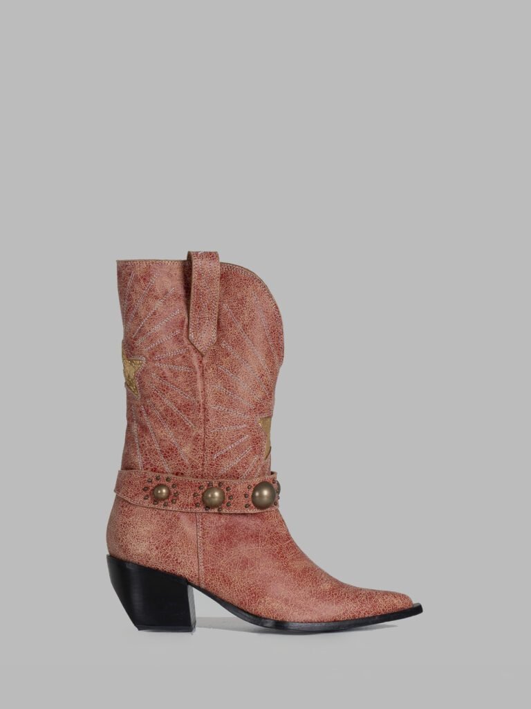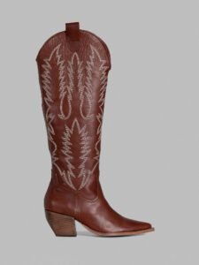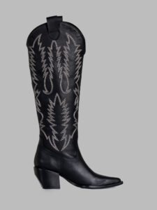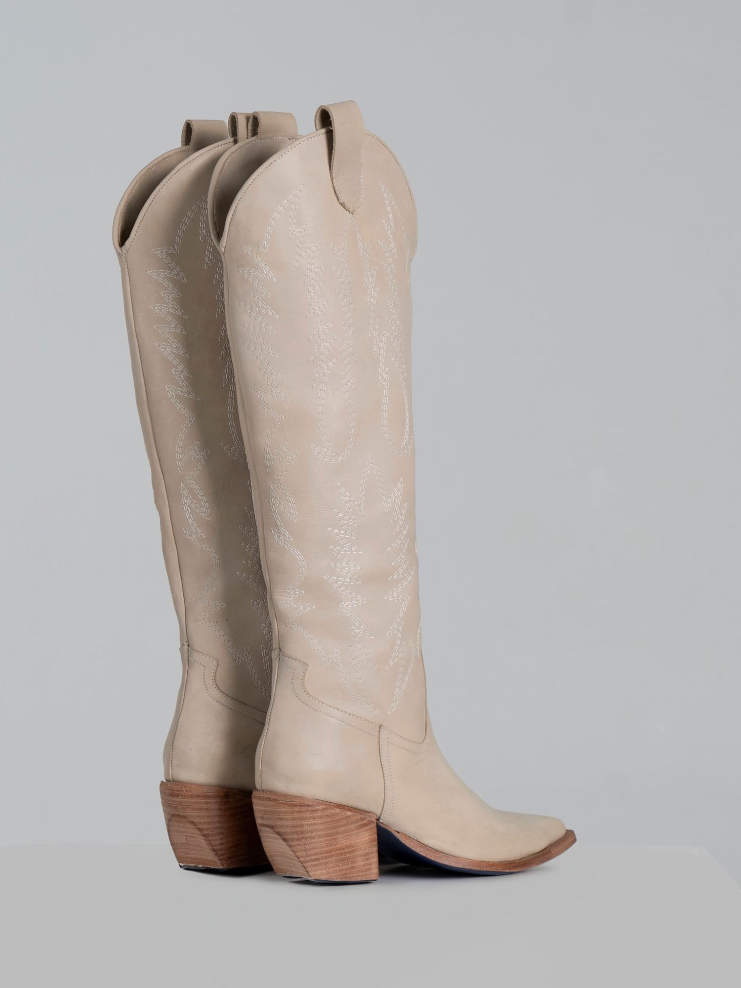 High-shaft boot crafted from beige cowhide leather with delicate embroidery in natural tones. Its defined structure and artisanal details create a blend of functionality and elegance.