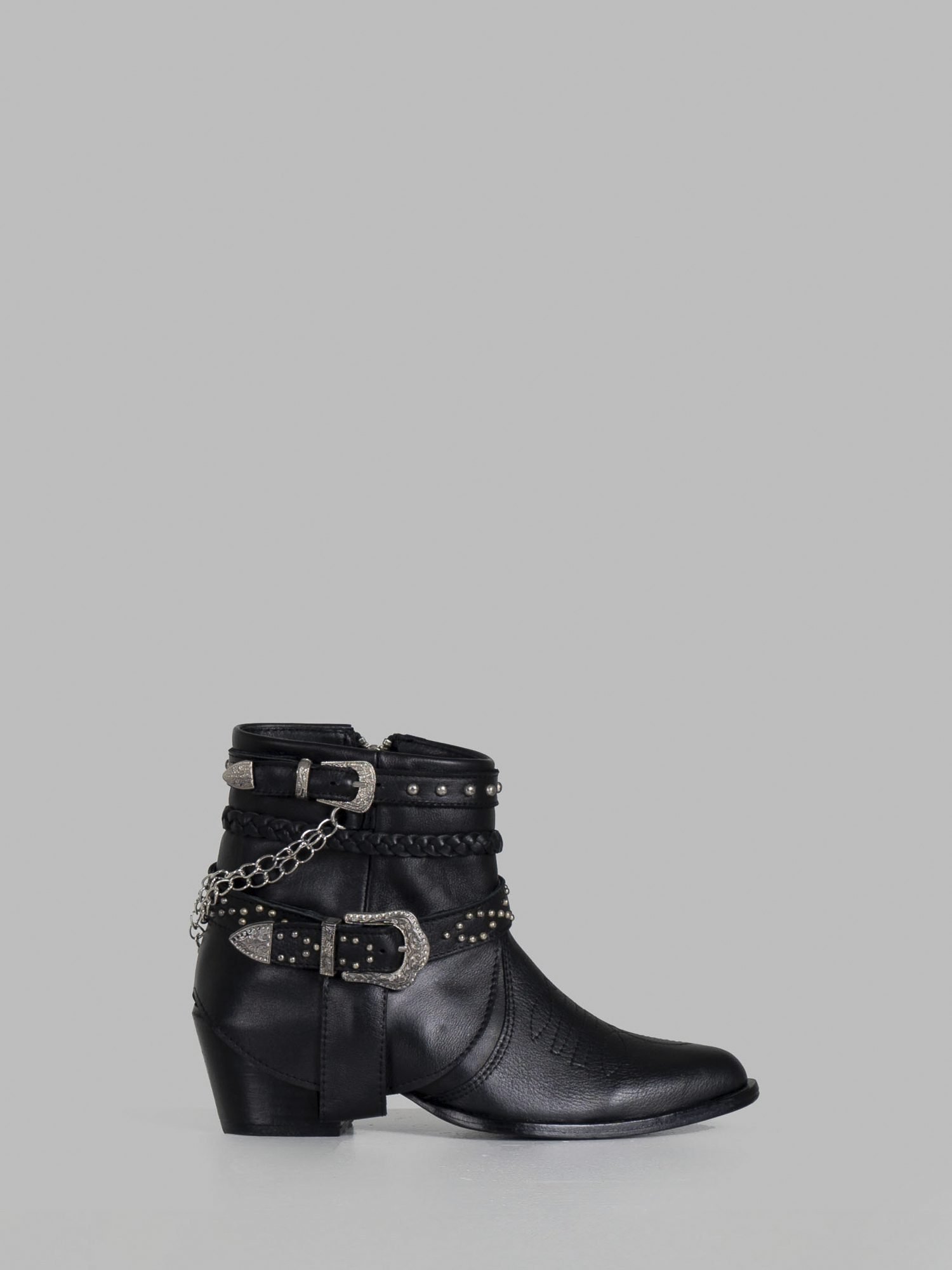 Low-shaft boot crafted from black cowhide leather. A bold silhouette defined by metallic accents, decorative chains, tonal stitching, and woven details.