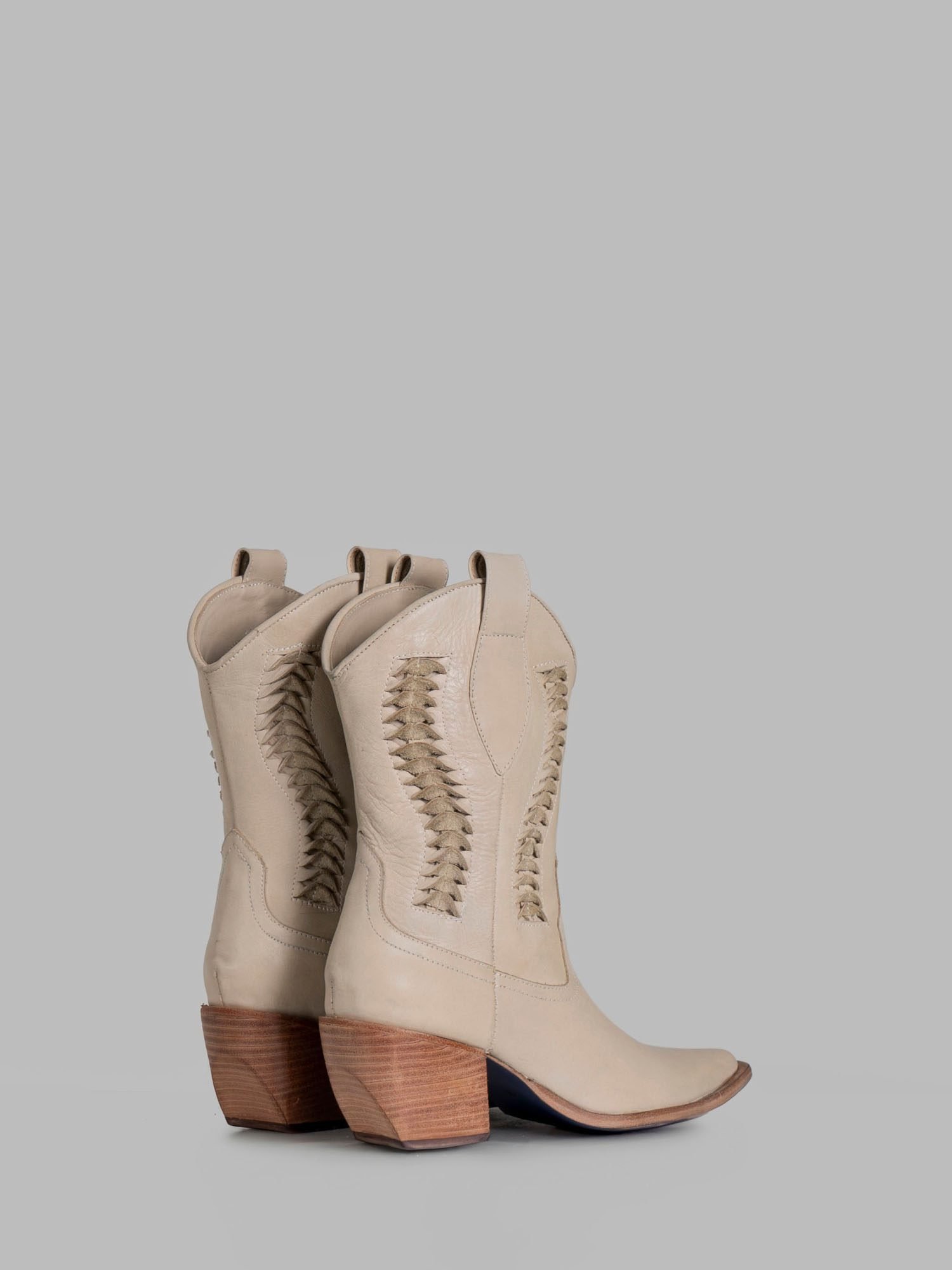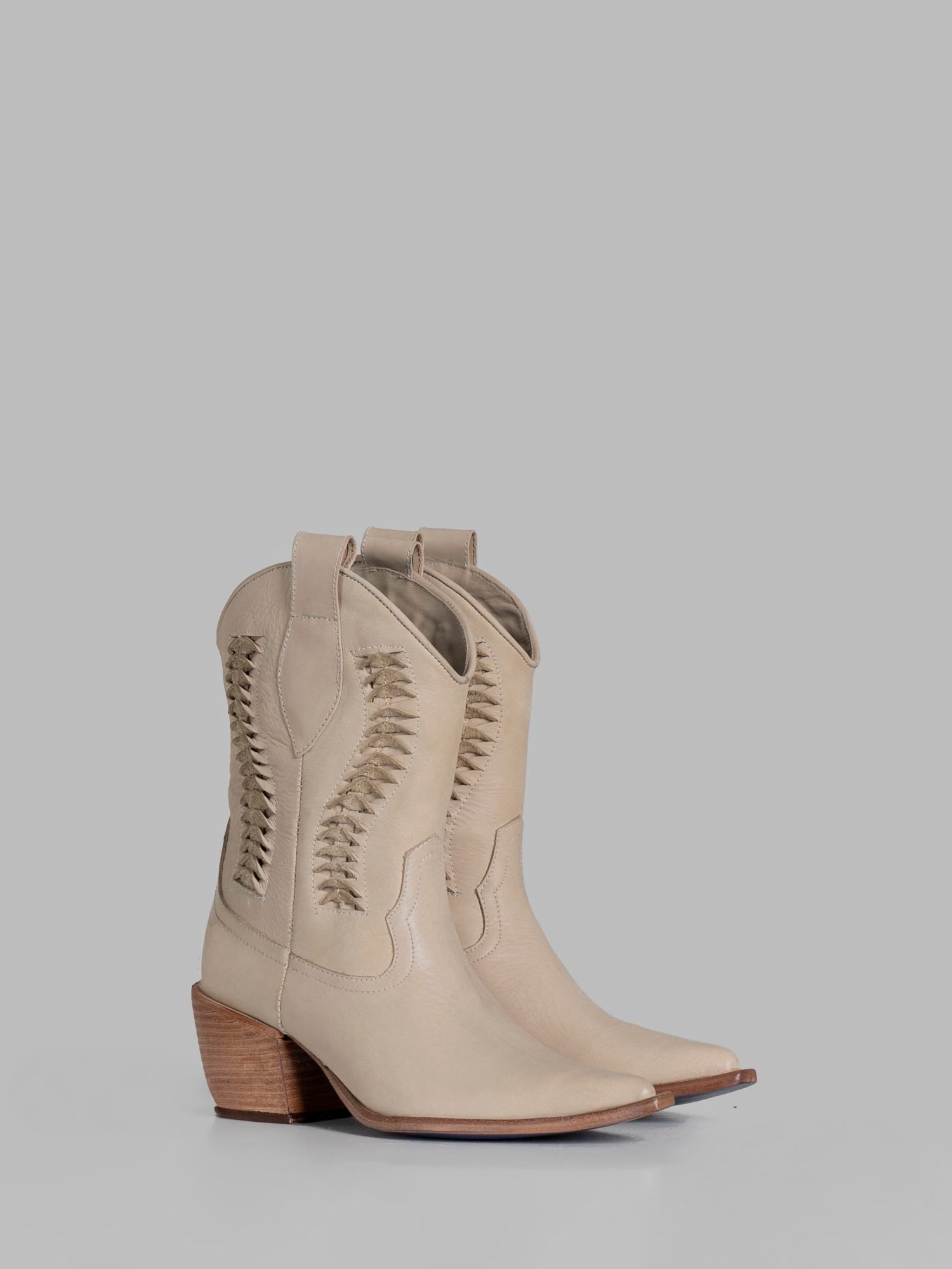 Low-shaft boot crafted from ivory-toned cowhide leather with textured and artisanal stitching that defines its identity. A versatile design that blends classic elements with modern touches for a timeless result.