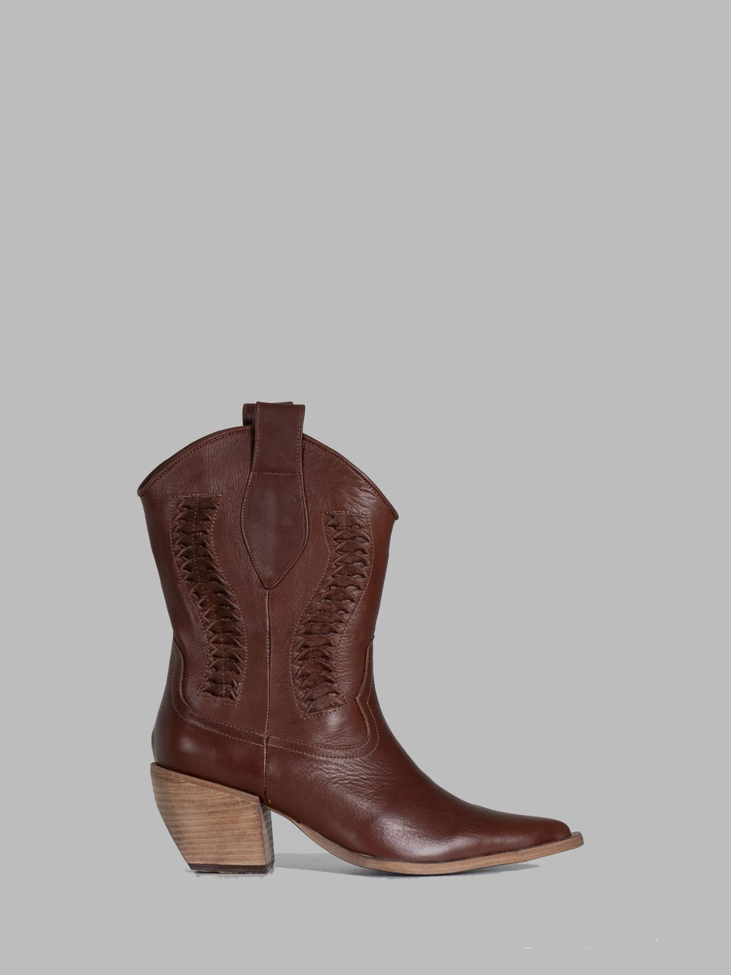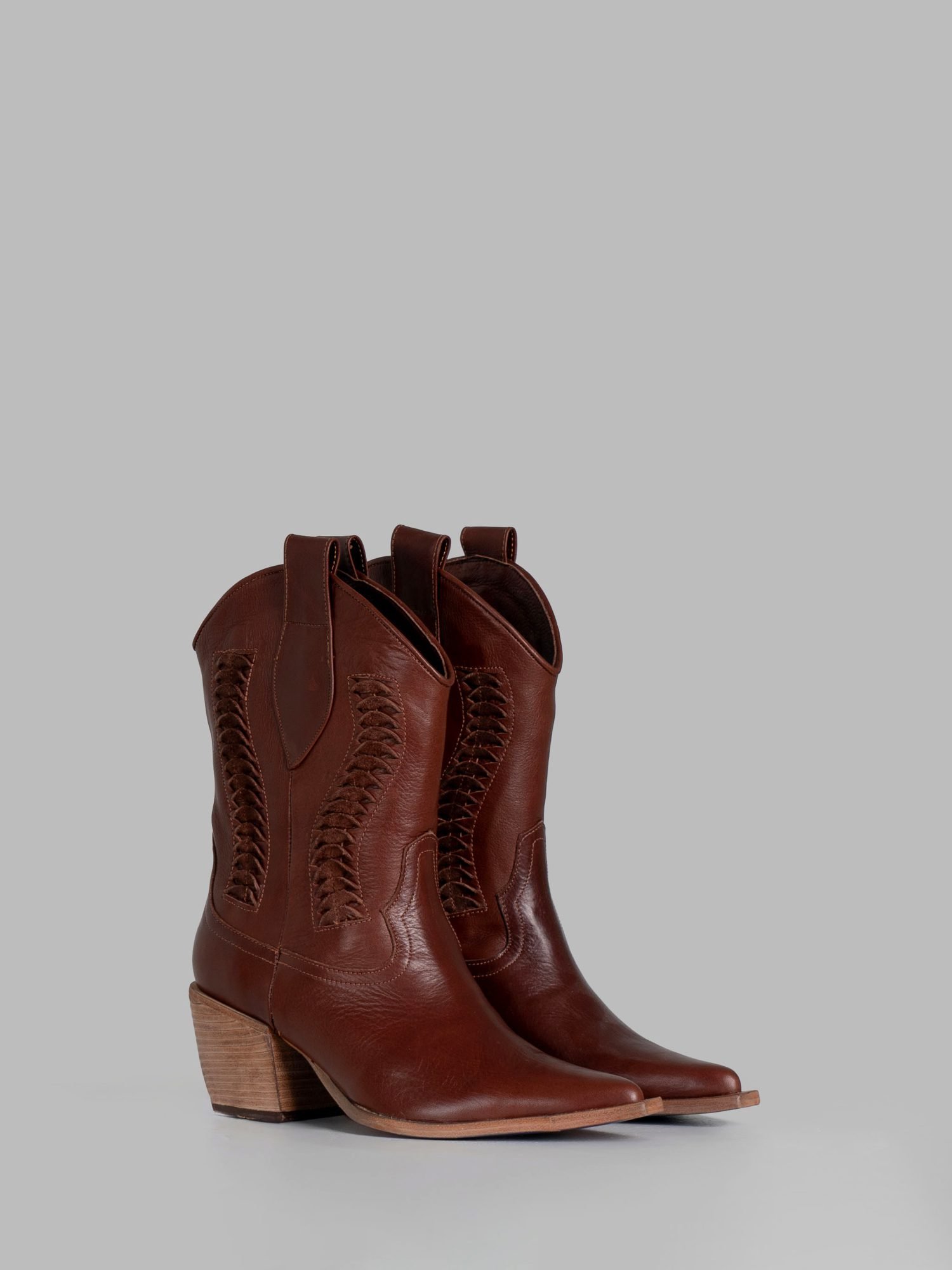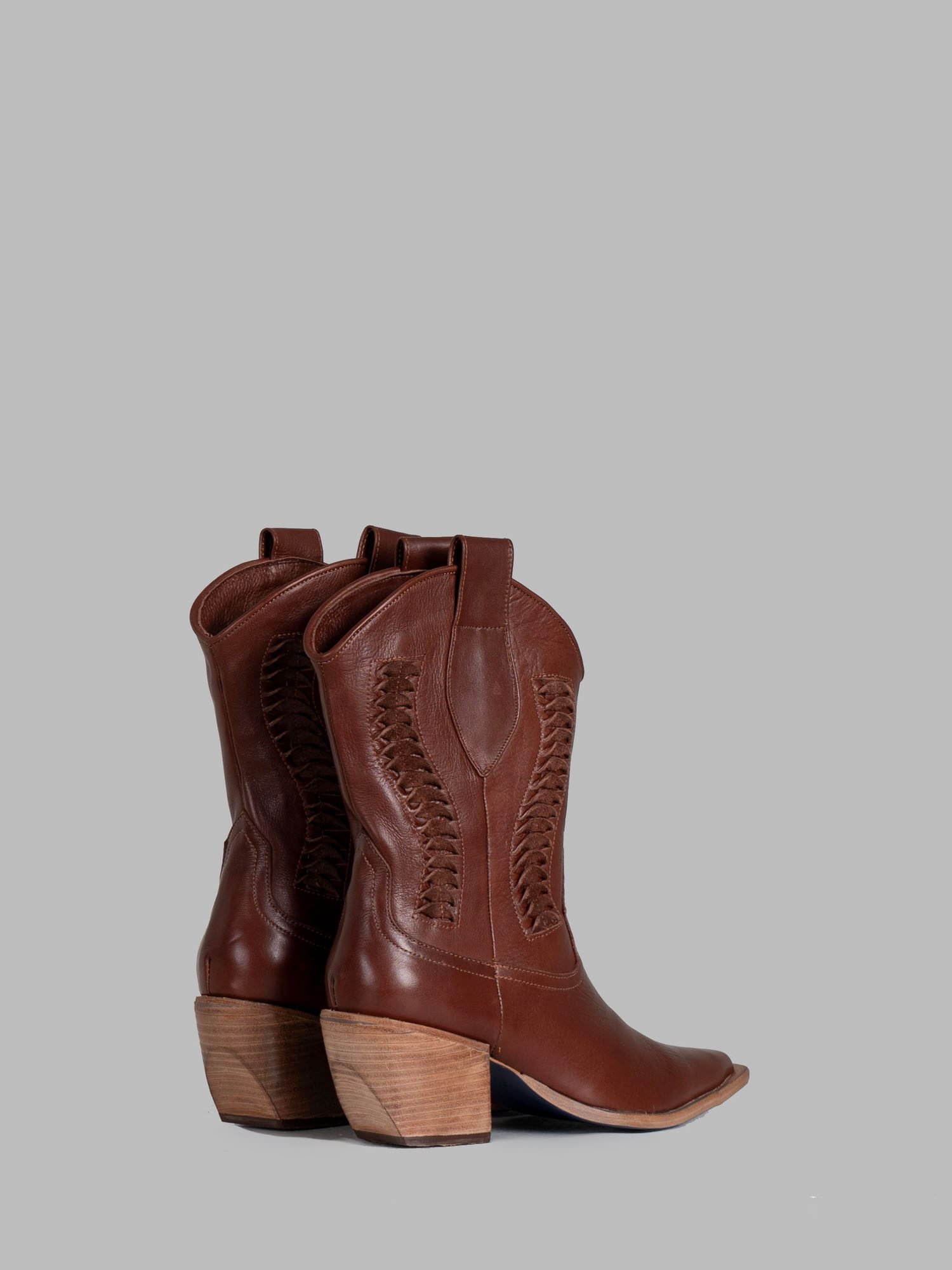 Low-shaft boot crafted from tan cowhide leather, with natural textures and artisan stitching that enhance its timeless aesthetic. A design that fuses tradition and modernity with subtle elegance.