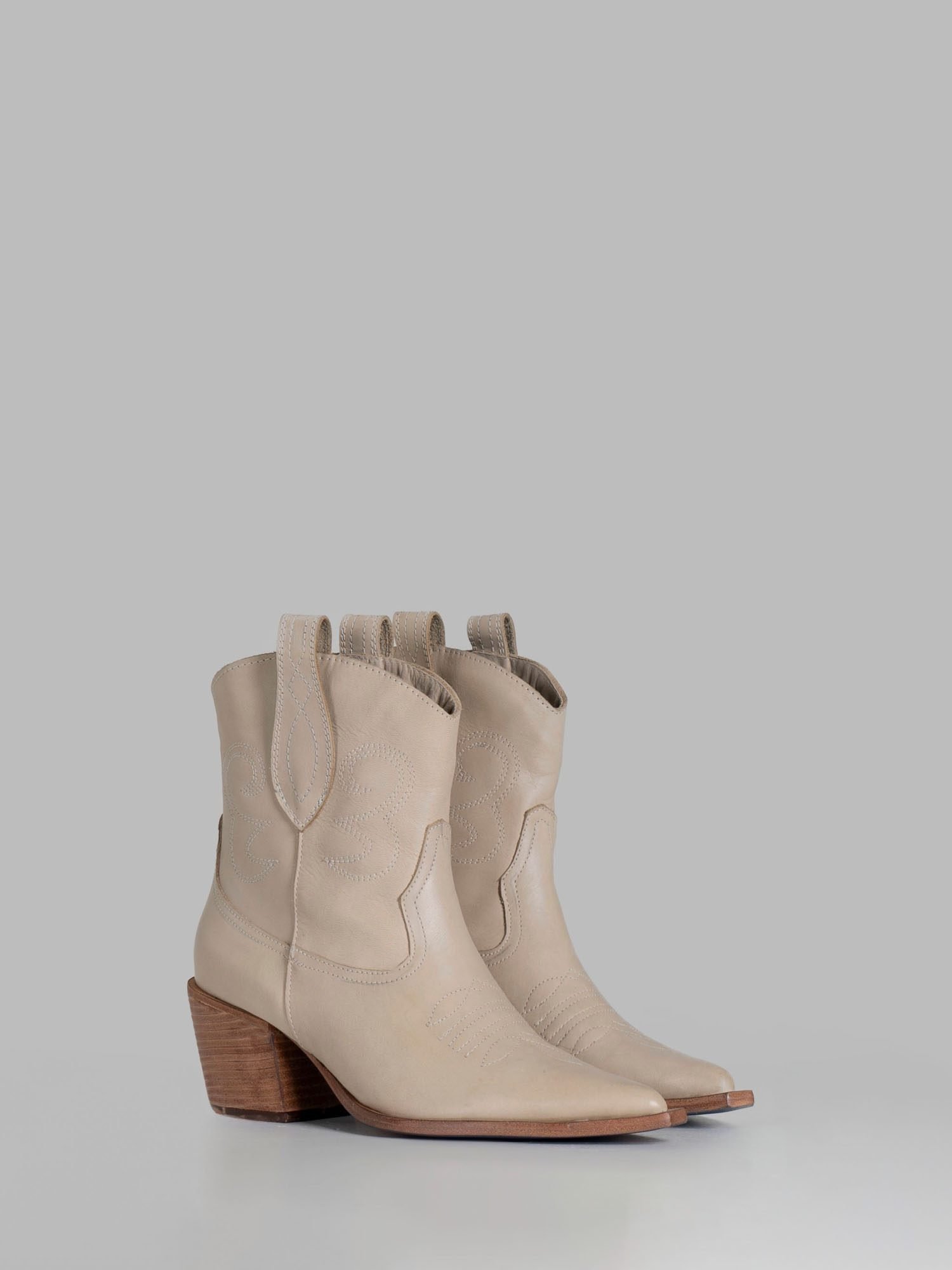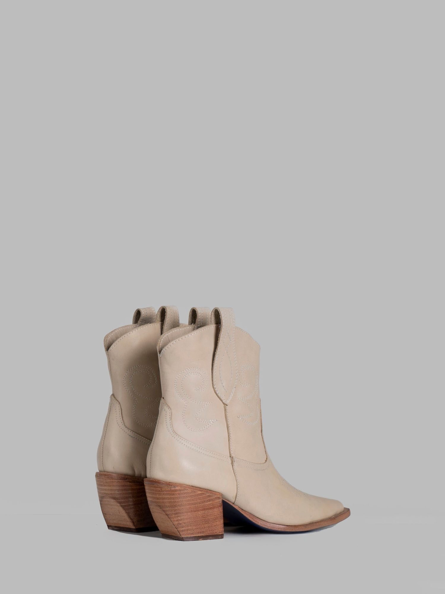 Low-shaft boot crafted from ivory-toned cowhide leather with a natural finish. A timeless silhouette that adds a sophisticated touch to any look.