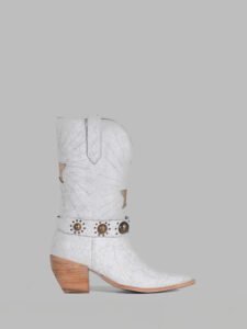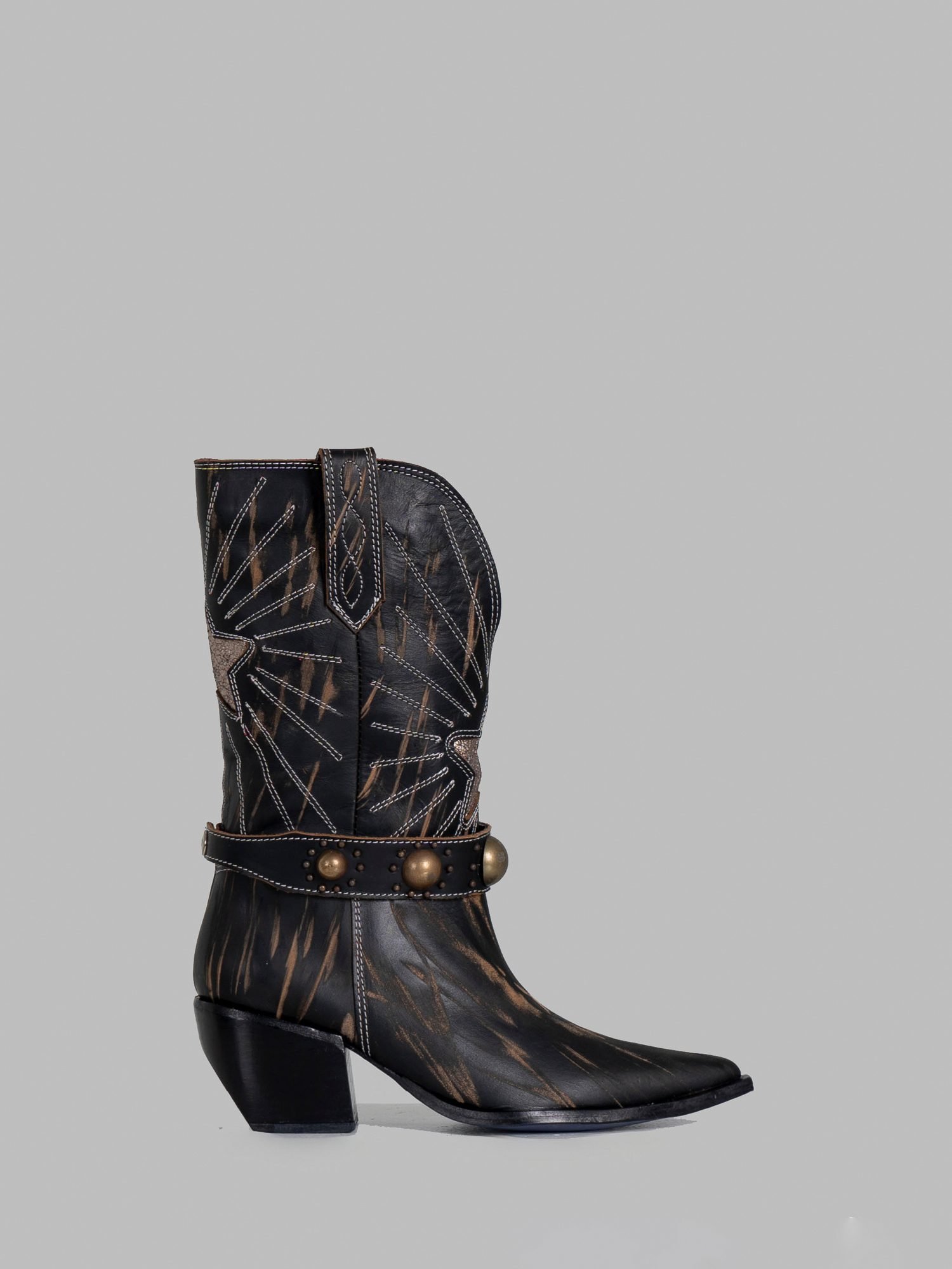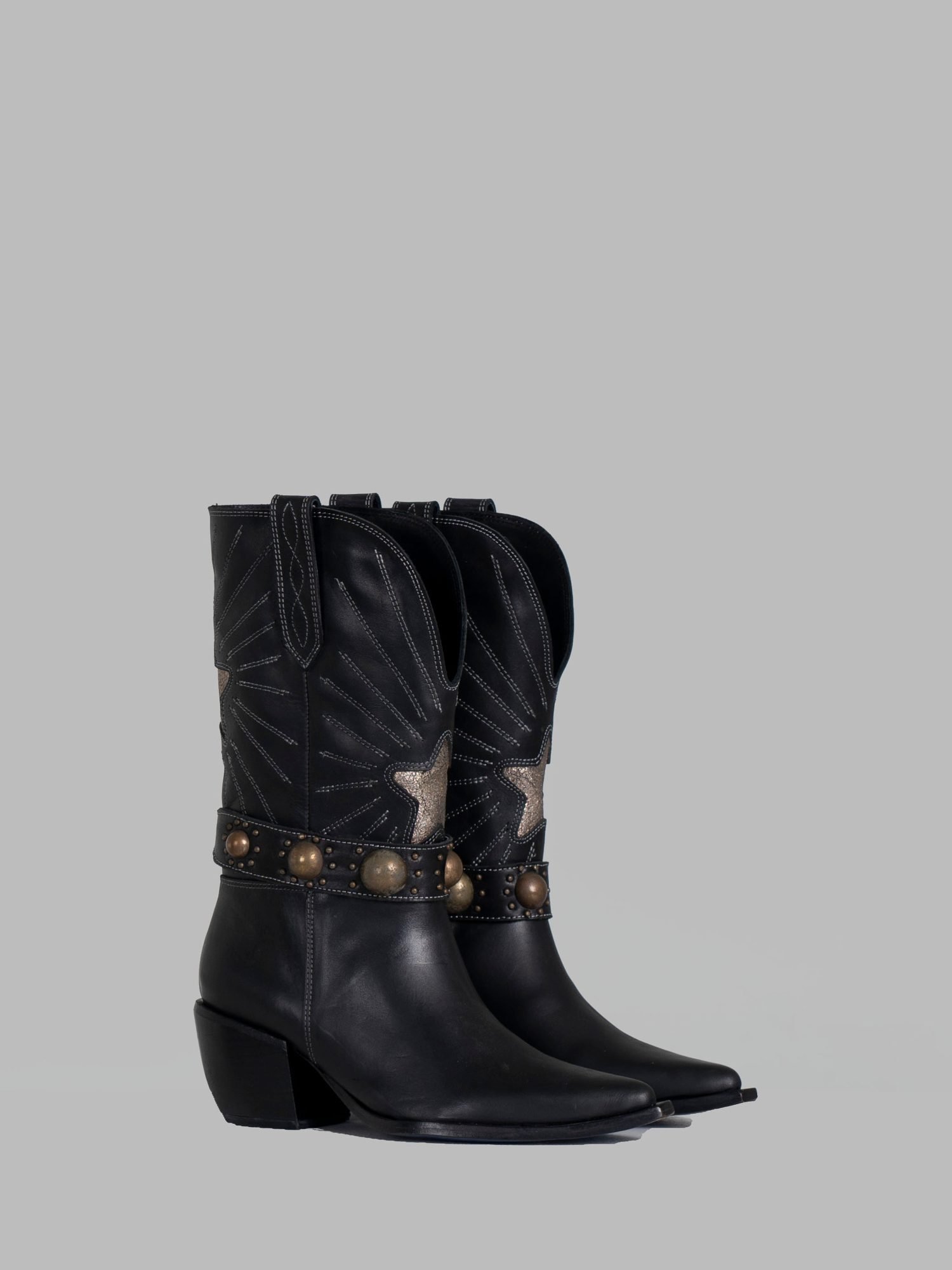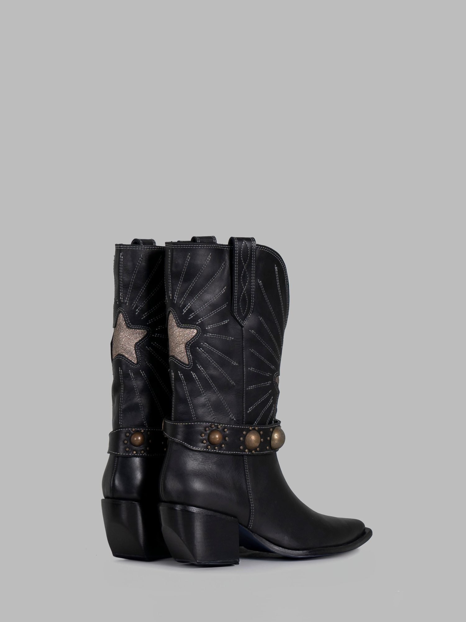 High-shaft boot crafted from distressed black cowhide leather. Its standout details—golden stars and metal accents—bring a rock-tinged edge to a handcrafted classic.
