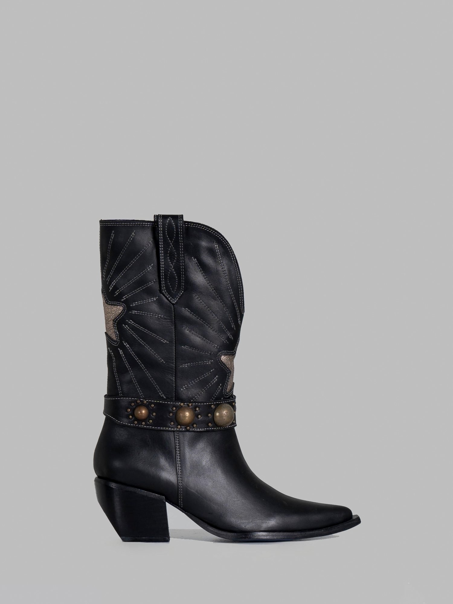 High-shaft boot crafted from black cowhide leather. With its golden stars and hardware, it becomes a powerful style statement that balances attitude and elegance.