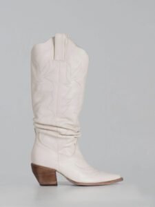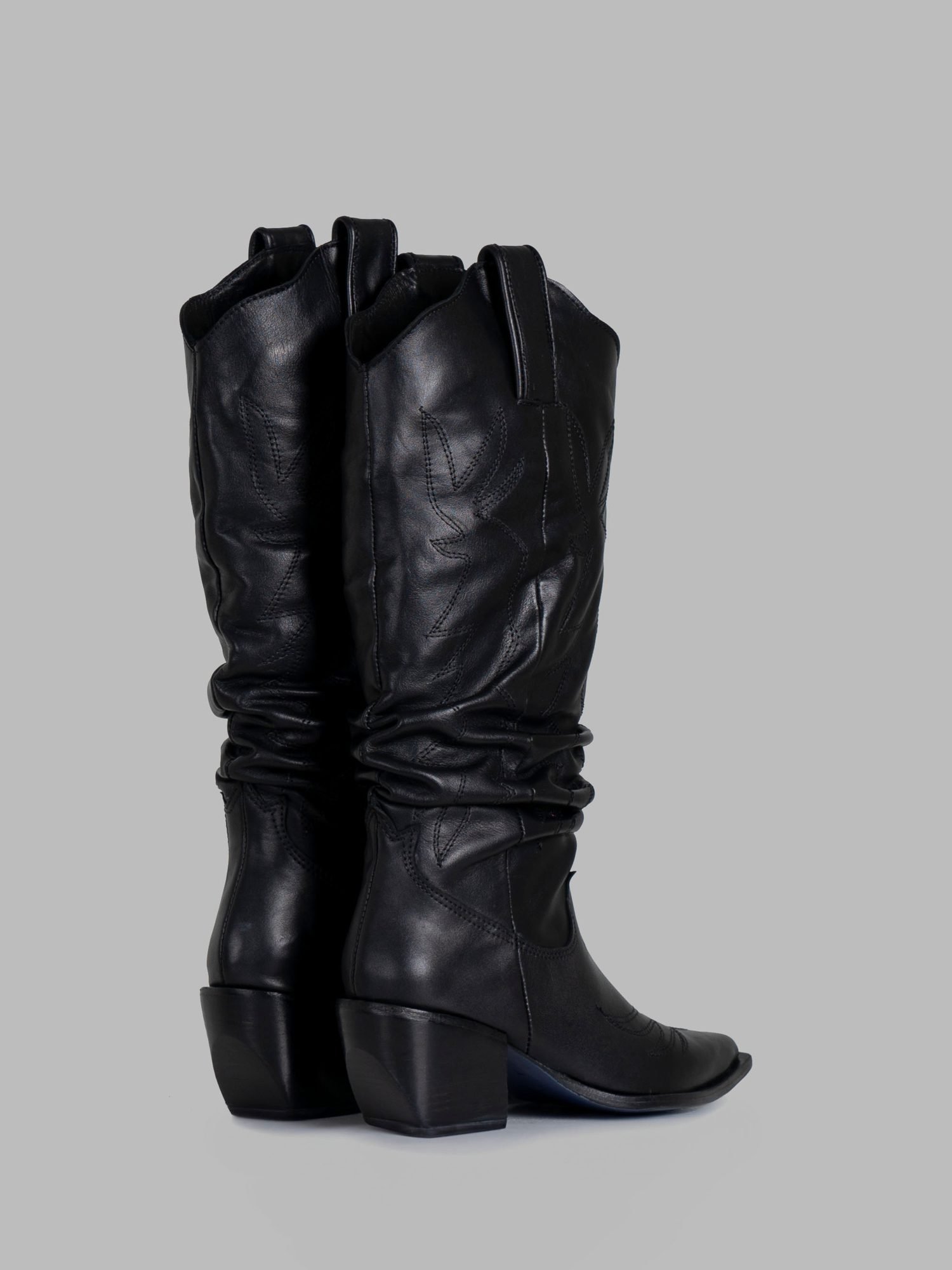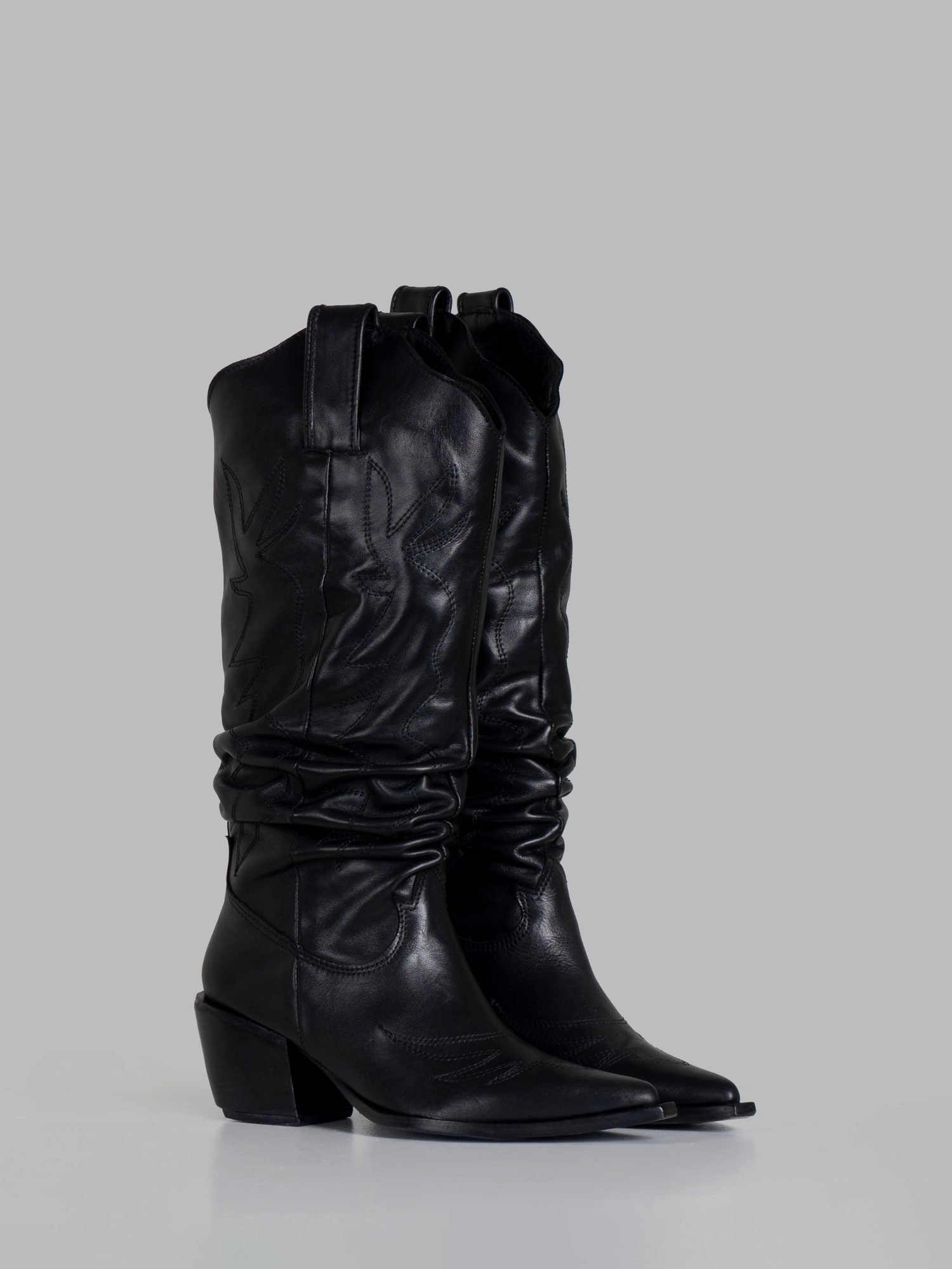 High-shaft boot crafted from natural-finish black cowhide leather. With soft pleats and tonal stitching, this design offers quiet elegance and an effortless fit.