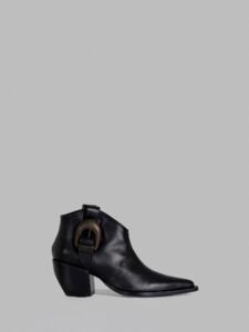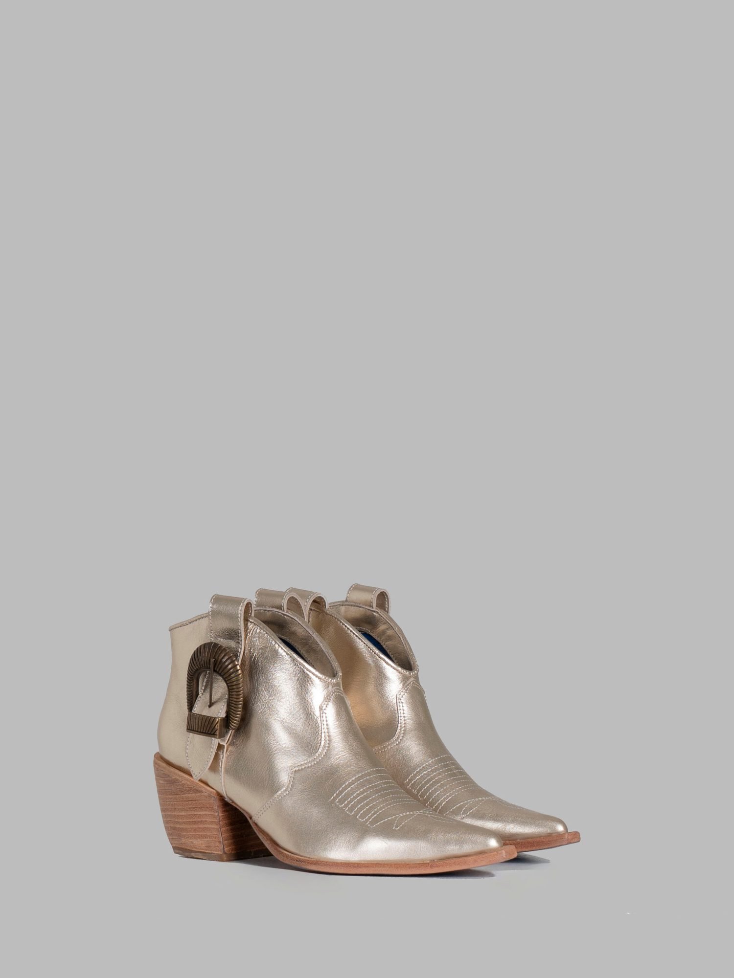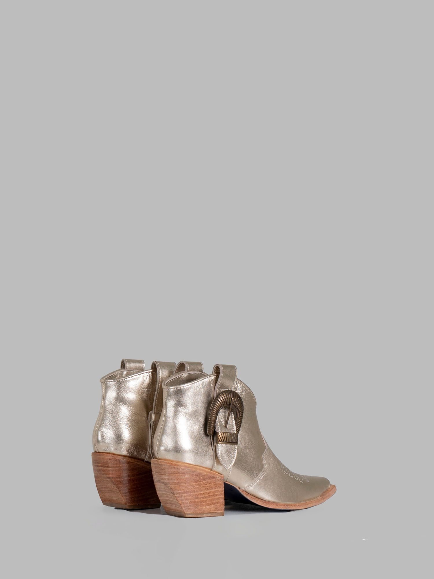 Low-shaft boot crafted from platinum-finish cowhide leather. Its refined design features a side metallic buckle that brings sophistication and character.
