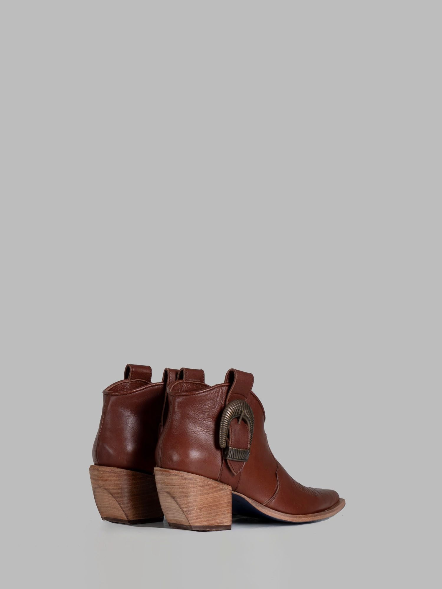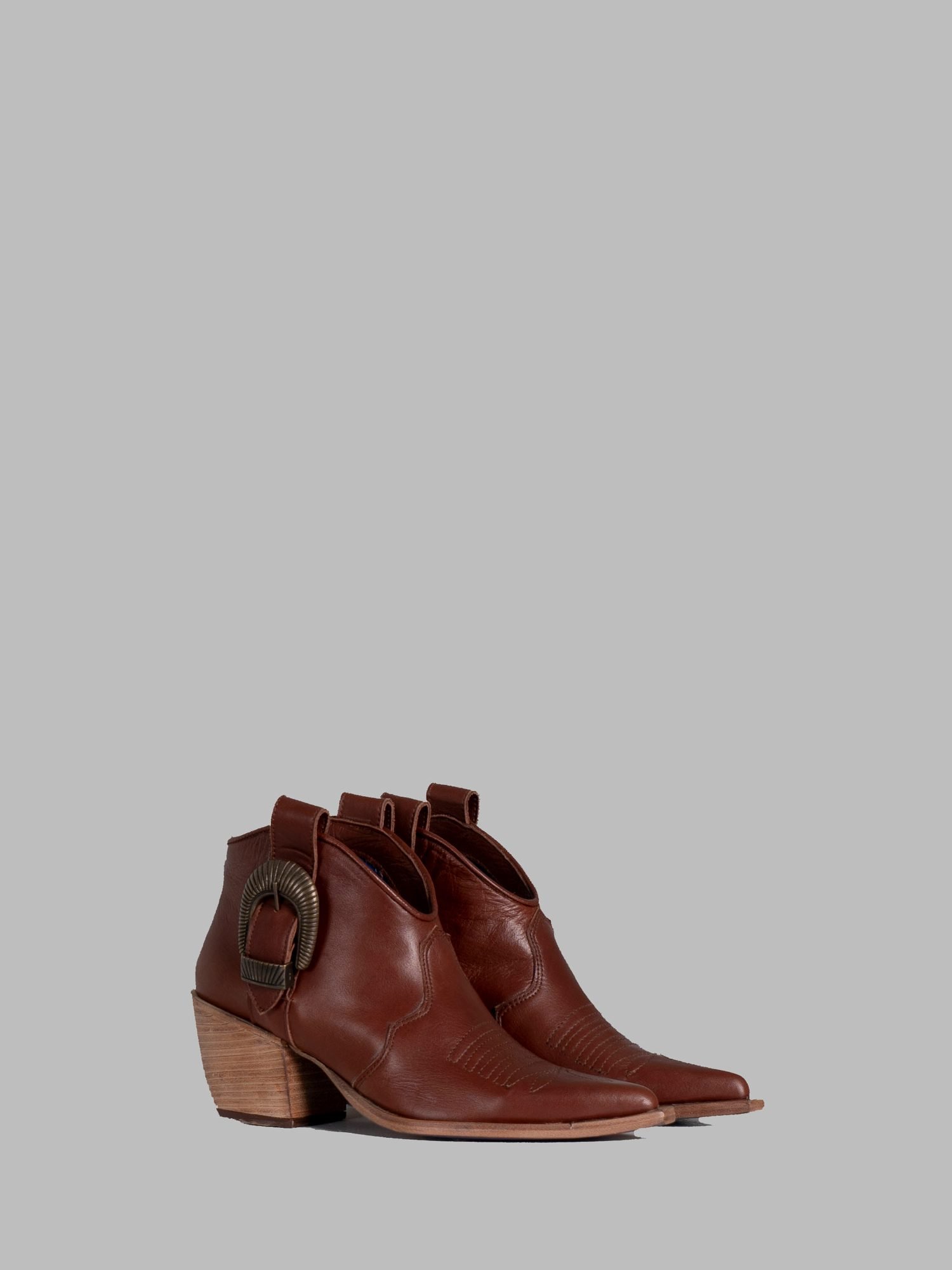 Low-shaft boot crafted from tan cowhide leather with a natural finish. A versatile design featuring a side metallic buckle. Perfect to pair with casual looks or to add flair to more dressed-up outfits.